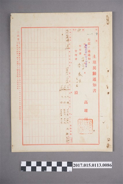 2017.015.0113.0086 高雄州李春生土地異動通知書