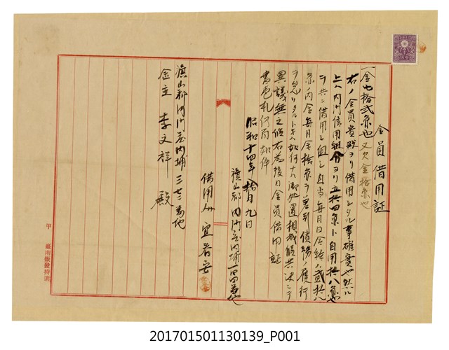 此份文物為「金員借用証」,上面寫著一金七拾貳圓也又欠金拾圓也,右金員貴殿借用,借出者為內門信用組合,時間為昭和十四年拾月九日,旗山郡內門莊內埔一四四番地,借用人為宜春安,金主為李文祥殿,旗山郡內門莊內埔三七二番地。內門信用組合創立於民國11年12月,為今內門鄉農會前身。金員借用証,就像是現在的借據一樣,而此借用人依姓氏可推斷為平埔族人,當時許多平埔族人為了耕作而需要資金,就會向信用組合借貸,才能買取肥料工具等農耕必需品。