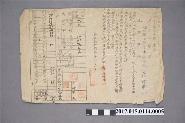 2017.015.0114.0005 簡汝泉成績單(臺中商業職業學校)