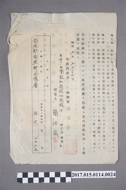 此含兩物件,一為契約書,另一件為領收證,從契約書內容來看,為住於台中州南投郡南投街465番地的簡添勝,購買國庫地,此地位於南投郡南投街三塊厝地區,面積為0.2525甲,契約條列出雙方權利義務關係,及需繳納購買金205圓與保證金21圓;領收證部分即為購買此地,繳納金額的證明。 自1898年台灣總租府民政長官後藤新平上任,開始進行台灣各舊習調查,並在台灣各地進行科學性的測量,土地亦為重點調查項目,此