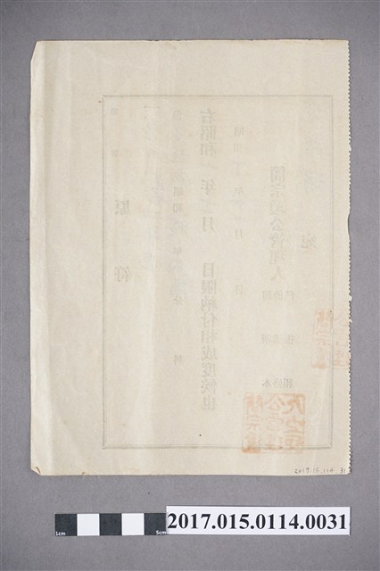 此為納稅原符,原符即存根之意,此為小租權業主納稅之證明,繳納物品不明,數量為六石四斗,由簡宗瓊公管理者三人所納,三人為簡朝木、簡添盛、簡振和,原符收據人為簡明緒。 清領以來,台灣土地呈現複雜所有權關係,由大租戶申請墾照,再分配土地至小租戶,小租戶再租土地給佃農,常有一田二主,甚至一田多主的情形發生,日治以後,實施土地調查,廢除大租權,保留小租權,使得小租戶成為業主,將複雜土地關係明朗化,形成一田