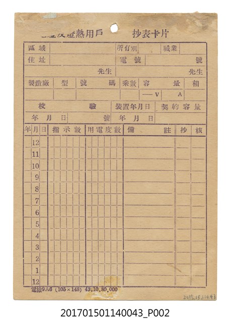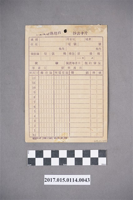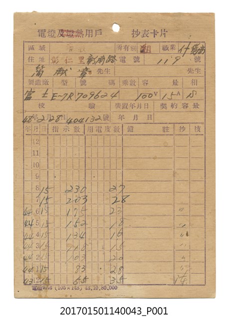 本物件為電燈及電熱用戶抄表卡片,其對於使用者之資訊及電力相關事務記載詳細,如:使用區域在南投,用戶為簡獻章先生,其職業別是什貨商…等。根據台灣電力公司之規定,表制用戶需由台電定期抄表收費,每三十天超一次表進行計算,而早期台灣計算電費之方式以「盞」表示,因為當時除了電燈外沒有其他電器,所以一個家庭以有多少盞燈做為計算。當時將電力引入電箱開關和電表,現在則因為家中用電量增加開始使用機械式電表,本來的抄