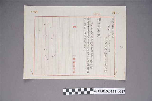2017.015.0115.0047 楊梅公學校長與湖口庄長之便簽