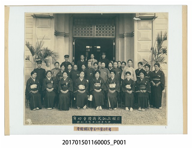 本文件為昭和十年十二月十七日愛國婦人會有功章授會之寫真,其中的婦人都著和服且左胸上佩戴著功章,其下寫有「有功章授與式紀念撮影」之字樣。愛國婦人會為1901年於東京創立之婦人團體,其不論在日本或台灣皆為上流社會女性所組成,主要從事社會事業,戰爭發生後工作性質改變,轉為分擔生活補助、慰問軍眷及遺族、軍事後援、救濟資金籌備等。其對捐款達到一定金額的有功幹部,會授與勳章或感謝狀。