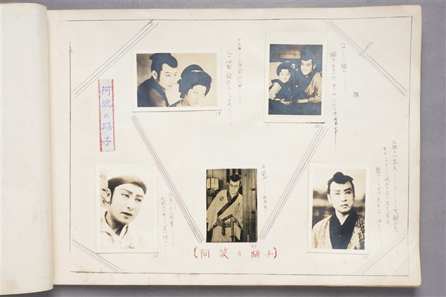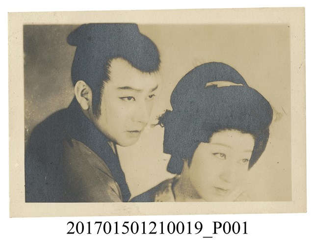 此為一男一女之側臉照,依照照片服裝與法式,非近代之日本服飾,照片旁有《阿波の踊子》字樣。《阿波の踊子》為東寶電影京都工作室製作,於1941年發行。整部電影的工作人員有:製作:滝村和男、氷室徹平;監督:マキノ正博;腳本:観世光太;原作:観世光太;攝影:伊藤武夫、 立花幹也;音樂:飯田信夫;美術:北村高敏;錄音:岡崎三千雄;照明:井上栄太郎;編輯:畑房雄;主演:長谷川一夫、 黒川弥太郎、入江たか子、高峰秀子、月田一郎、清水金一、鳥羽陽之助、汐見洋、清川荘司、清川虹子、沢村貞子、横山運平、高堂国典、進藤英太郎、沢井三郎、三田国夫、瀬川路三郎、冬木京三、永井柳筰、石川冷、長島武夫。