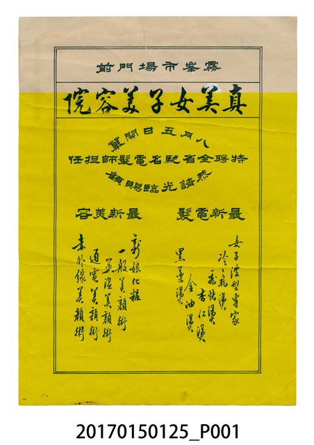 此為「真美女子美容院」的廣告,內容寫道八月五日開業,營業項目分為兩項,一為最新電髮技術,內容為女子波型專家、冷氣燙、杏仁燙、金油燙……等等。二為最新美容技術,內容為新娘化妝、一般美顏術、通電美顏術……等等。