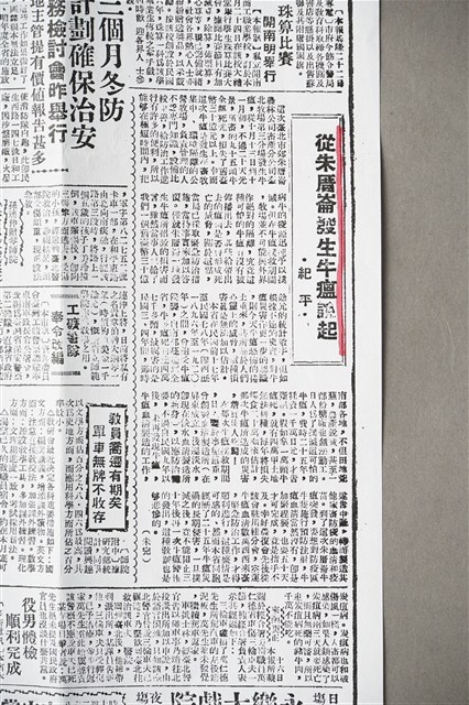 此為台灣於1949年關於牛瘟之新聞,並且特別報導協助防牛瘟之獸醫專家賴辛格,標題為「獸醫專家賴辛格 攜牛瘟毒苗抵臺」。這個牛瘟事件發生於台北市郊朱厝崙○林公司畜產分公司台北牧場第三分場,從10月13日至11月初,所畜95頭牛全死光,所幸農復會因前車之鑑而立即空運牛瘟血清來臺,進行緊急防治工作,才得以順利進行。這段期間內,農林處不僅派專員赴現場了解急調查,並也擬定牛瘟緊急防疫辦法,如宣傳單的發放、牛瘟幻燈片播映及講解,更實施牛健康檢查、牛瘟預防注射的工作,並禁止屠宰牛隻及販賣牛肉,至1950年3月11日,農林會派員分赴各鄉鎮區實施畜牛疫情調查結果證實已無病牛發生。