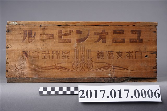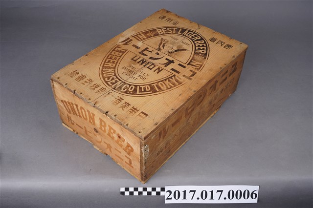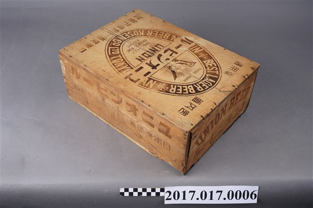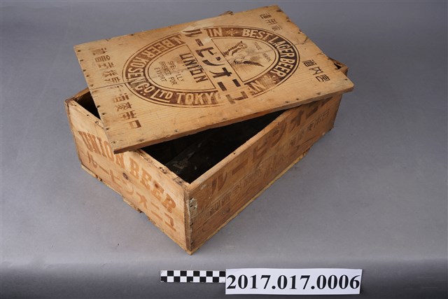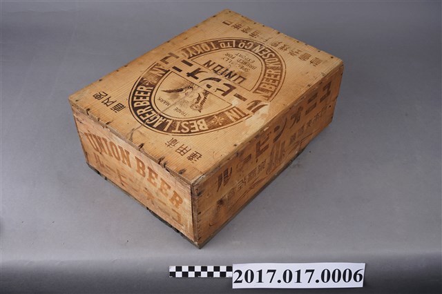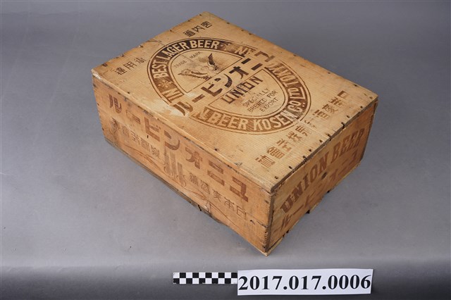 本文件為日本麥酒鑛泉聯盟啤酒木箱,製造時間於1920年至1930年之間,為日本麥酒鑛株式會社販售之聯盟啤酒的木箱,以減少啤酒運送過程中產生的碰撞,其商標為受持桂冠與麥穗的羽翼天使。1906年大阪啤酒(朝日啤酒的前身)、日本啤酒(惠比壽啤酒),札幌啤酒過合併成大日本啤酒有限公司,成為當時日本國內最大的啤酒生產公司。當時日本為了減緩國內市場的激烈競爭並加強出口實力,而透過合併企業的方式達成資本集中的目的。大日本啤酒之後陸續收購東京啤酒、日本啤酒礦泉(另稱聯盟啤酒)、櫻桃啤酒。第一次世界大戰後,工廠開始進入大陸青島製造啤酒,但至二戰後因經濟因素被分成兩個公司經營(朝日啤酒與日本啤酒)。