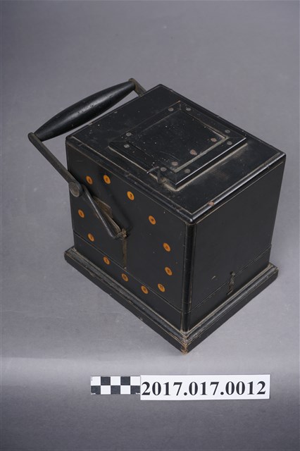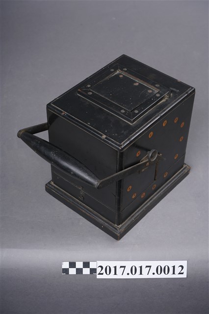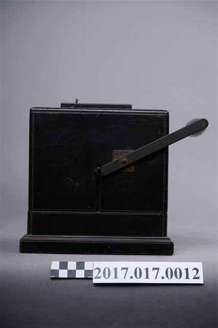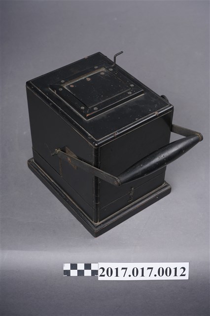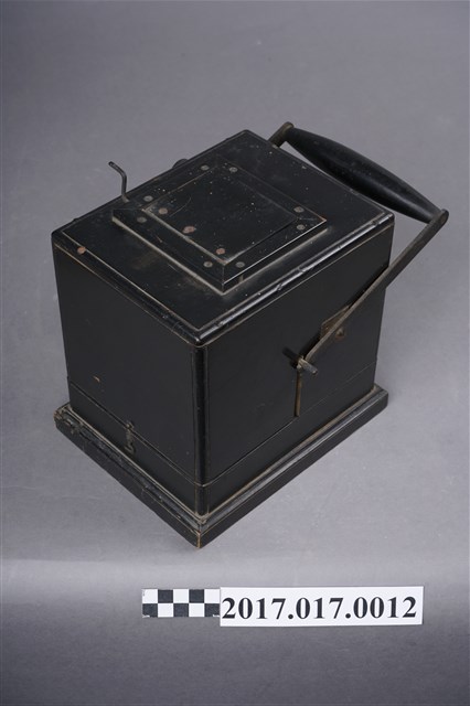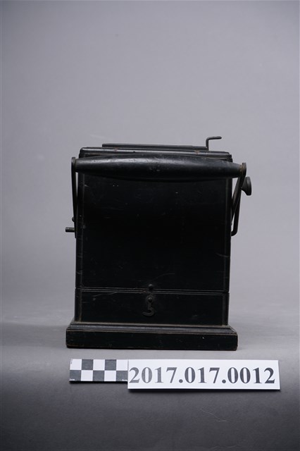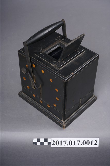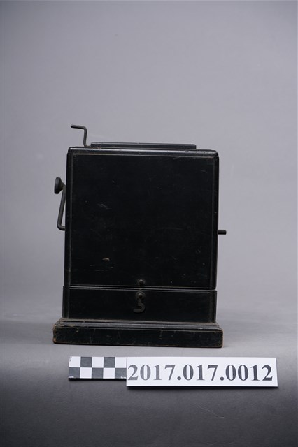 本文件為YR牌手搖看片箱,全機以木材與金屬製成分成3個部分,上蓋設有方形孔洞並附有掀蓋、側方則貼有1至12標籤與YR交錯之商標,中間層夾有木製12邊形木盒,每面貼有一片長方形黑板,側方設有鐵製手把,可供旋轉。下方則為方置底座,側有直溝。本件文物主要是觀看手繪的捲型圖片使用,類似投影機,圖片放置其中,觀賞者由眼睛靠近上面方形孔洞觀看內容。