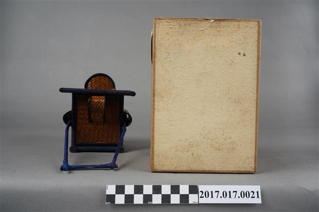 本物件為竹編轎子紀念品,共有收納盒一件、竹編轎子一件,土黃色外殼上貼有臺灣特產竹籠細工(山一物產脈所)及其地點與電話番號,盒內僅有牛皮紙並無襯布。至於竹編轎子模型以真實竹編轎子等比例縮小製成,模型製作精細。