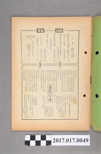 本書為《週報》第129號。目次:滿州經濟建設之現況、兵役法變更、重建隻英國海軍與對日作戰、南昌攻略戰經過、日義文化協定,新東亞讀本主題:東亞百年小史。日本政府在1937年蘆溝橋事變、1939年二次世界大戰開打,並進入戰時體制後也開始對言論進行統一工作,本週報為內閣情報部所編輯以週刊形式發行,其發行旨趣在於向一般民眾宣傳、說明目前政府所推行的政策目的與內容,並公告目前各機關的內外情勢、經濟學術情報等,期待以此週報與民眾緊密結合,刊物內的廣告也多配合國策之保險、戰時體制相關的廣告,訴求全民一心。