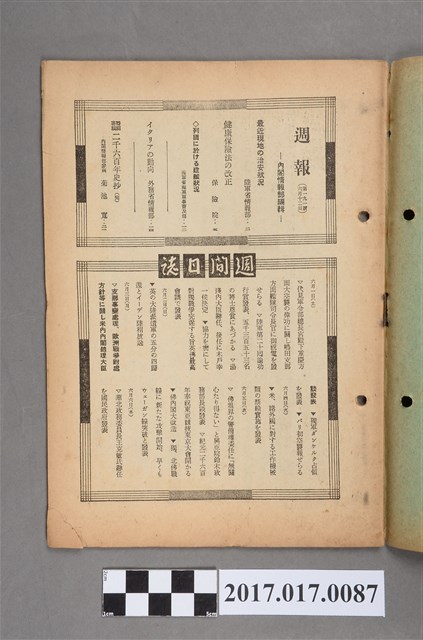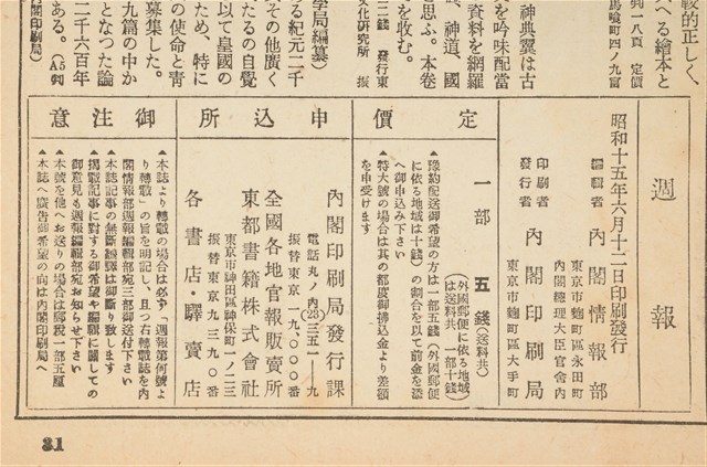 本書為《週報》第191號。此份文物為日治時期報刊,封面寫著週報6月12日號,第191號昭和11年(1936)10月1日第3種郵便物認可,昭和15年(1940)6月12日發行,每周一回水曜日發行,還寫有目錄「最近現地の治安狀況」、「健康保險法の改正」、「列國に於ける建艦狀況」、「イタリアの動向」、特別寄稿二千六百年史抄(完)內閣情報部參與菊池寬,一份5錢;封底有支那事變國債的廣告。首頁內容有興亞建設的廣告,上面是國民政府遷都紀念塔;還有週間日誌;「最近現地の治安狀況」陸軍省情報部,寫有兵匪的蠢動狀況、共產匪兵的狀況、新政府成立的影響;「健康保險法の改正」保險院;神武天皇御紀謹解;「列國に於ける建艦狀況」;「イタリアの動向」外務省情報部,寫有英佛紙和伊紙的論戰、戰時體制的強化、英佛對伊交涉決裂、總兵力等;寫真週報;二千六百年史抄(十七)菊池寬,寫有廢籓置縣和征韓論、日露戰爭以後。