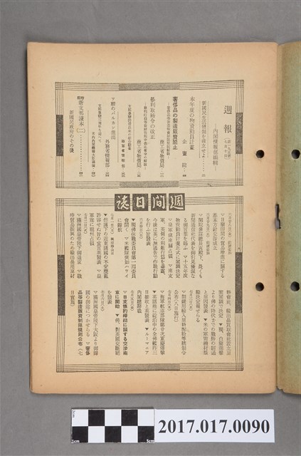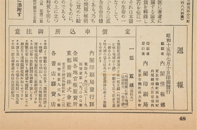 本書為《週報》第195號。此份文物為日治時期報刊,封面寫著週報7月10日號,第195號昭和11年(1936)10月1日第3種郵便物認可,昭和15年(1940)7月10日發行,每週一回水曜日發行,還寫有目錄「統制の強化と國民生活」、「本年度の物動計畫」、「奢侈の品製造販賣禁止」、「暴力取締令の改正」、「ソ聯のバルカン進出」、「新支那讀本2-新國民政府のその後」,一份5錢;封底則有牙膏的廣告。首頁內容宣傳「戰時下だ!!堅實な生活を」;週間日誌;末頁有昭和研究會事務局的廣告「昭和研究會刊行物」。