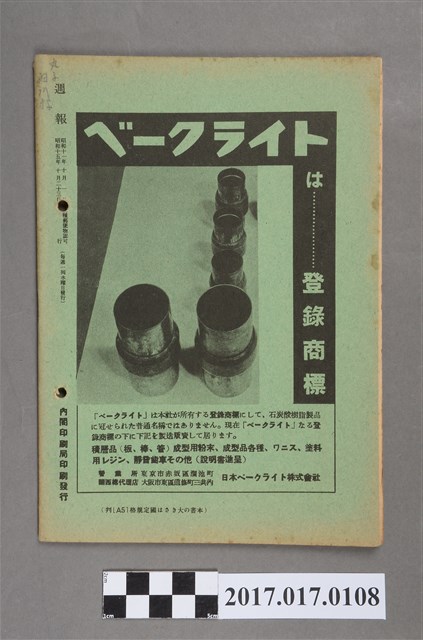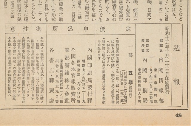 本書為《週報》第211號。此份文物為日治時期報刊,封面寫著週報10月23日號,第211號昭和11年(1936)10月1日第3種郵便物認可,昭和15年(1940)10月23日發行,每週一回水曜日發行,還寫有目錄「強化された總動員法」、「價格停止の一年延長」、「賃金はどうなる」、「銀行等資金統制令」,一份5錢,封底則有工業用具、零件的廣告。首頁內容有宣傳「大政翼贊的臣道實踐」,還有週間日誌;「強化された總動員法の解說」,寫有架等統治令的改正;「銀行等資金運用令にるいて」大藏省,寫有適用範圍、資金運用計畫的調整、運轉資金與流動資金的貸出調整等;「精動、大政翼替運動」;「紀元二千六百年奉祝,第十一回明治神宮國民體育大會」厚生省,內容提及此集會人數約莫五萬人;「ル─マ二ア樞軸の傘下に入る」外務省情報部,寫有獨伊羅的新國境保障;寫真周報十月二十三日號;「新支那讀本13」內閣情報部編,寫有鑛業北中支方面的情況;末頁有日產自動車販賣株式會社的廣告。
