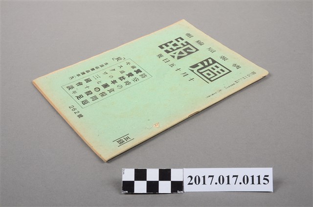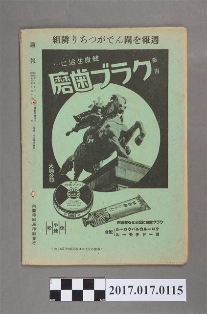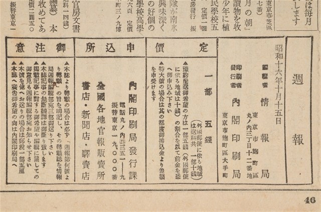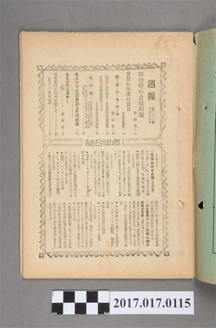本書為《週報》第262號。此份文物為日治時期報刊,封面寫著情報局編輯週報10月15日號,昭和11年(1936)10月1日第3種郵便物認可,昭和16年(1942)10月15日發行,每週一回水曜日發行,還有寫著目錄「防空時の食糧問題」、「翼贊壯年團の發足」、「鐵道の七十年」、「モスクワ三國會談」、「炭生活必需品讀本(九)」,一份5錢,封底則有牙膏的廣告.首頁宣傳有靖國神社,內容部分則有週間日誌;「防空時の食糧問題」農林省,寫有重要都市的米穀準備;「翼贊壯年團の發足」寫有結成的目的、活動的內容;「鐵道の七十年」寫有鐵道的開通、統一經營、輸送量的增加、共榮圈的確定與鐵道、鐵道省;「最近の大陸戰況」大本營陸軍報道部,寫有敵人的動向、大陸作戰的概況、南北支方面;「支那方面艦隊の戰況」大本營海軍報道部,寫有航空部隊、艦艇及陸戰隊;「生活必需品讀本ㄞ9炭」;告知板;末頁有內閣部印刷之日本精神叢書廣告。