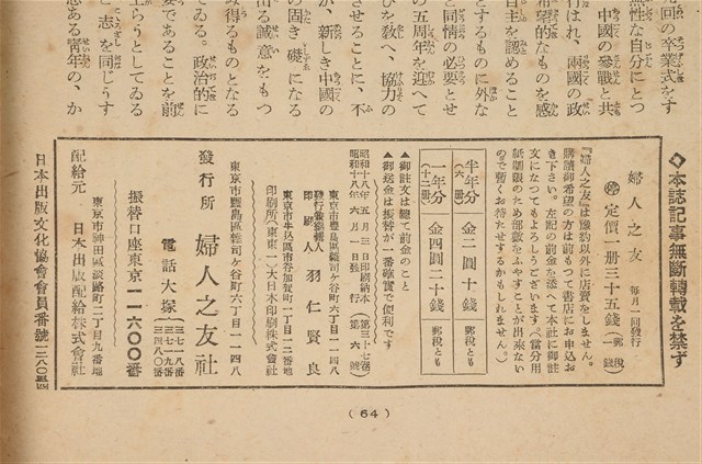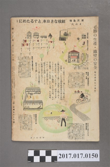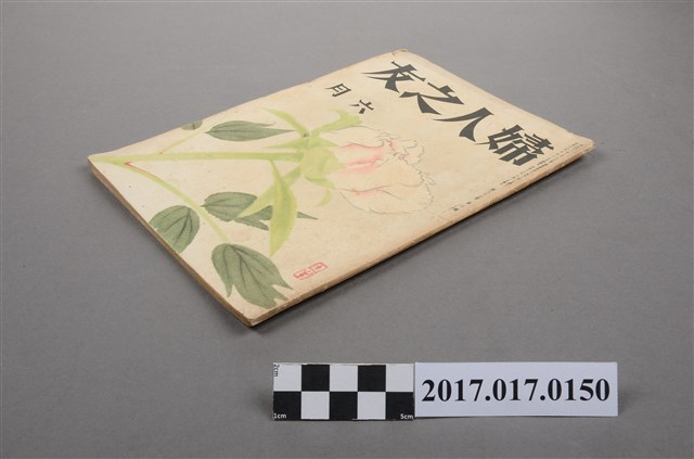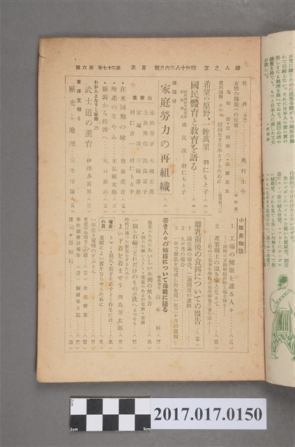 1.本物件為婦人之友社發行之《婦人之友》第37卷第6號,內容為:希望の原野 一眸萬里/羽仁とも子、國民體育と教育を語る/羽仁とも子、座談會家庭勞力の再組織、在米同胞の歌/齋藤茂吉、増産のなやみ/末弘嚴太郎、新潟から佐渡へ/大口喜六、わが人となりし家庭武士道の薰育/伊澤多喜男、東洋文明歷史と地理/三宅雪嶺、小隊長物語 工場の健康を護る人々 産業戦士の温き家となりて、離乳前後の食餌についての報告、若き人々の結核について母親に語る/山本杉、節米のためにおいしいお粥の炊き方、一個の石鹼でどれだけのものが洗へるでせら時代に適った服装をするためによい下着を着ませう/西島芳太郎、トマト・胡瓜・茄子を必ずよく作るには果樹によい実をならせろために、一年生と家鴨のざぶとん、東北の小母さんの話(三二)生活歌集、奉仕部會計報告(六三)編輯室日記、雜司ケ谷短信。2.日本大正末期至昭和初期,由於關東大地震連帶使社會不景氣,出版社開始流行出版円本(類似專題書籍,常見命名為xx全集稱之)與文庫書(以A6為尺寸的書),除了一般書籍的編印外,為了及時反映社會訊息雜誌遂逐漸流行,譬如1932年日本圖謀建立滿州國時,日本國內就出現許多評論當時中國大陸的相關消息,1937年由於蘆溝橋事變,日本為了確保軍事物資,遂進行經濟統制,日本出版界便以情報宣傳機關管理國家力量開始介入,1938年甚至公告兒童雜誌字數限制、附錄廢止等政策,隨著戰事緊張,一些較無戰爭宣傳的雜誌被統合廢止,兒童或婦人雜誌也無法倖免,戰後,雜誌出版才得以逐一恢復。婦人之友社創立於1903年前身為『家庭の友』,創辦人為羽仁もと子與羽仁吉一,創刊目的基於基督教信仰如何向民眾傳達及經營理想家庭,而今(2015)仍持續發行。