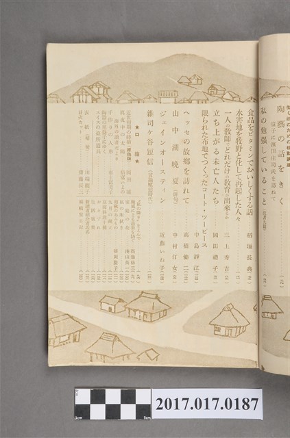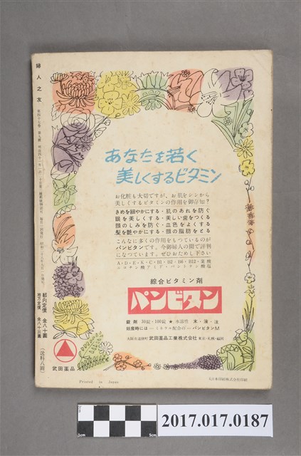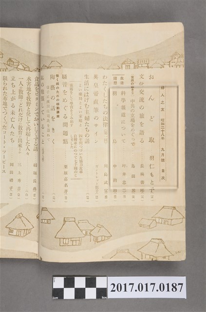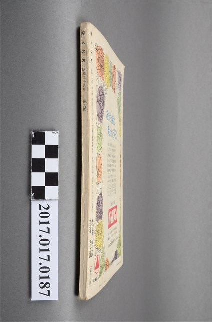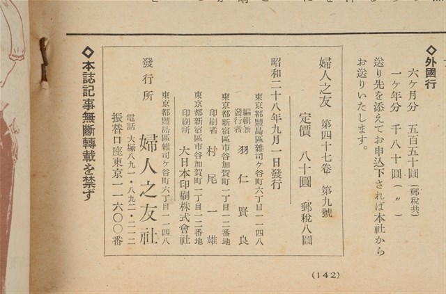 本物件為婦人之友社發行之《婦人之友》第47卷第9號,內容為:おんど取/羽仁とも子、文化交流の旅を語る、中共の立場をめぐって/島田、科學報道について/坪井忠二、羽鳥/中勘助、わたししたらの法律/川島武宜、英皇帝直筆のサイン/ガントレット恒子、生活にはげむ主婦たちの話、騷音をめぐる問題點、私の勉強していること、食品をビタミンでおいしくする話/稻垣長典、水害地を牧野と化して再起した人々、一人の教師でどれだけの教育ができるか/三上秀吉、立ち上がる未亡人たち/岡田禮子、限られた布地でつくったコートツーピース/中島靜江、ヘッセの故郷を訪れて/高橋健二、山中湖晚夏/中村汀女、ジエインオースティン/近藤いね子、”私の隣り”をよんで、九月の獻立、私の床拭き、颱風による落果を防ぐ/高龜格三、家庭の花/淺山英一、初秋のおみもの/?岡澄子、豆腐料理十種、新讀者紹介者氏名、おどずれ、生活歌集、編輯室日記、雜司ヶ谷短信、口繪。日本大正末期至昭和初期,由於關東大地震連帶使社會不景氣,出版社開始流行出版円本(類似專題書籍,常見命名為xx全集稱之)與文庫書(以A6為尺寸的書),除了一般書籍的編印外,為了及時反映社會訊息雜誌遂逐漸流行,譬如1932年日本圖謀建立滿州國時,日本國內就出現許多評論當時中國大陸的相關消息,1937年由於蘆溝橋事變,日本為了確保軍事物資,遂進行經濟統制,日本出版界便以情報宣傳機關管理國家力量開始介入,1938年甚至公告兒童雜誌字數限制、附錄廢止等政策,隨著戰事緊張,一些較無戰爭宣傳的雜誌被統合廢止,兒童或婦人雜誌也無法倖免,戰後,雜誌出版才得以逐一恢復。婦人之友社創立於1903年前身為『家庭の友』,創辦人為羽仁もと子與羽仁吉一,創刊目的基於基督教信仰如何向民眾傳達及經營理想家庭,而今(2015)仍持續發行。