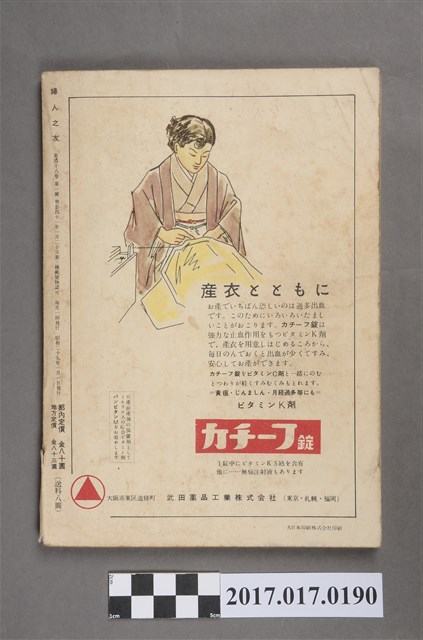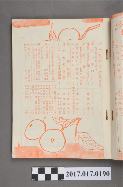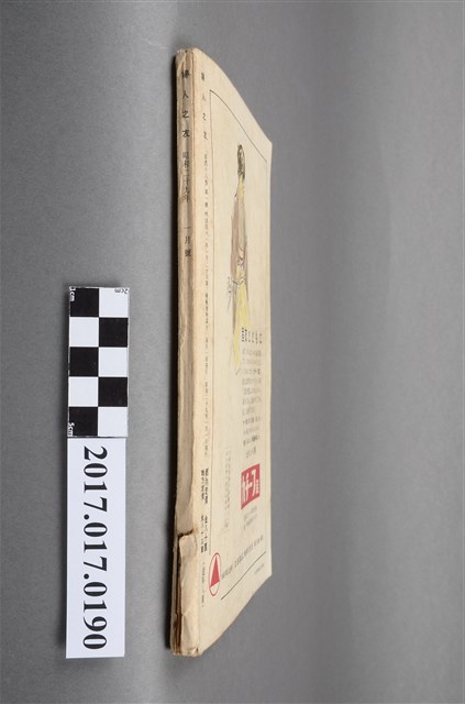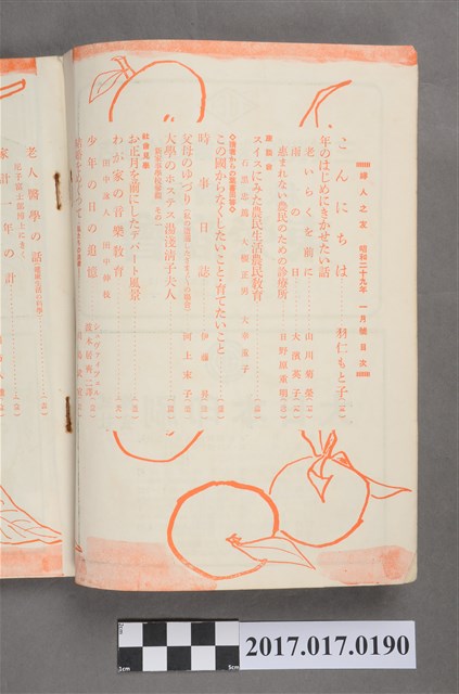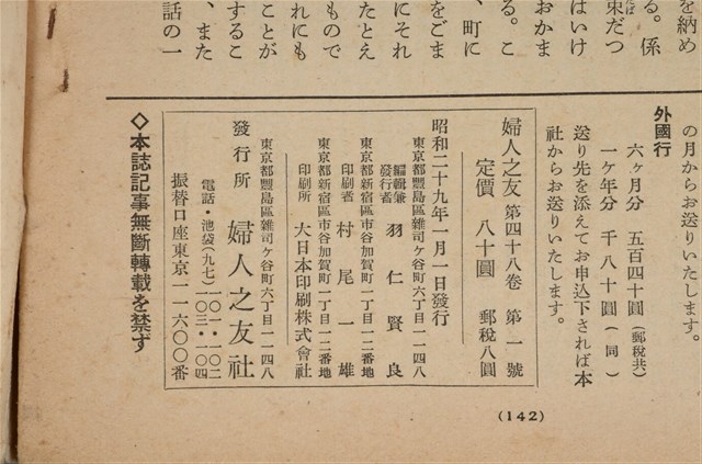 本物件為婦人之友社發行之《婦人之友》第48卷第1號,內容為:こんにちは/羽仁とも子、年のはじめにきかせたい話、スイスにみた農民生活農民教育、この国からなくしたいこと育てたいこと、時事日誌/伊藤昇、父母のゆつり/河上末子、大学のホステス湯浅清子夫人、お正月を前にしてデパート風景、わが家の音楽教育、少年の日の追憶/波木居齊二、結婚をめぐって/川島武直、老人醫學の話、家計一年の記、豫算をたてる前に知っておきたいこと/關島久雄、私の日記、パンと麵をおいしく/東京友會の食事部、家着を温かく清潔に/中島靜江、草木越年/土屋文明、月のわの唐笛/室生犀星、レーペンシエルド家の指輪/萬澤まさ、へだての壁を打破って、にかん/稻垣長典、病蟲害の防除/高龜格三、石油コンロ/加藤市次郎、正月餅問答/澤崎梅子、朝食の工夫、おどずれ、生活歌集/若山喜志子選、生活非句/星野立子選、友の會のページ、おとずれ、編輯室日記、雜司ヶ谷短信、口繪。日本大正末期至昭和初期,由於關東大地震連帶使社會不景氣,出版社開始流行出版円本(類似專題書籍,常見命名為xx全集稱之)與文庫書(以A6為尺寸的書),除了一般書籍的編印外,為了及時反映社會訊息雜誌遂逐漸流行,譬如1932年日本圖謀建立滿州國時,日本國內就出現許多評論當時中國大陸的相關消息,1937年由於蘆溝橋事變,日本為了確保軍事物資,遂進行經濟統制,日本出版界便以情報宣傳機關管理國家力量開始介入,1938年甚至公告兒童雜誌字數限制、附錄廢止等政策,隨著戰事緊張,一些較無戰爭宣傳的雜誌被統合廢止,兒童或婦人雜誌也無法倖免,戰後,雜誌出版才得以逐一恢復。婦人之友社創立於1903年前身為『家庭の友』,創辦人為羽仁もと子與羽仁吉一,創刊目的基於基督教信仰如何向民眾傳達及經營理想家庭,而今(2015)仍持續發行。