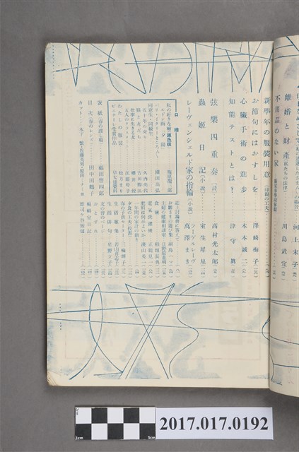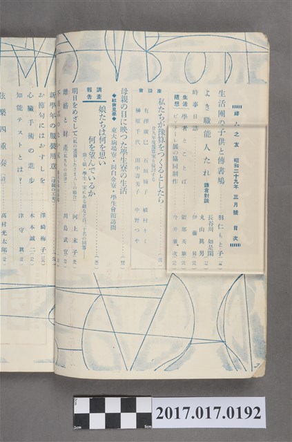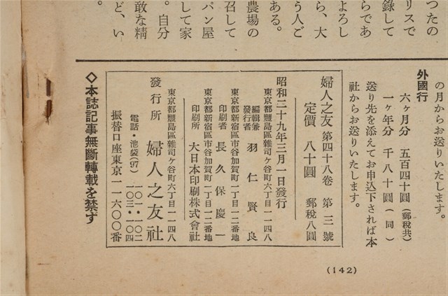 本文件為婦人之友社發行之《婦人之友》第48卷第3號,內容為:生活團の子供と傳書鳩/羽仁とも子、よき職能人たれー鎌倉對談/長谷川如是閑丸山真男、時事日誌/伊藤昇、學者とことば/隈部英雄、ビエナーレ展の協同制作/今井兼次、私たちが豫算をつくるとしたら、親の目に映った学生寮の生活、娘たちは何を思い何を望んでいるか、明日をめざして/河上末子、離婚と財產/川島武宜、不用品のない家、新學年の服裝用意、お節句にはおすしを/澤崎梅子、心臟手術の進步/木本誠二、知能テストとは?/津守真、弦樂四重奏/高村光太郎、蟲姬日記/室生犀星、レーペンシエルド家の指輪/萬澤まさ、誌上討論會に答えて、お雛さまの遊び集/副島ハマ、主婦の健康相談室/日野原重明、食鹽/稻垣長典、電氣洗濯機/正親見一、肥料は何がよいか/淺山英一、一年間の家計の働き、夕食の工夫、春の子供せーター/三輪輝子、生活歌集/若山喜志子、生活非句/星野立子、友の會のページ、おとずれ、編輯室日記、雜司ヶ谷短信、口繪。日本大正末期至昭和初期,由於關東大地震連帶使社會不景氣,出版社開始流行出版円本(類似專題書籍,常見命名為xx全集稱之)與文庫書(以A6為尺寸的書),除了一般書籍的編印外,為了及時反映社會訊息雜誌遂逐漸流行,譬如1932年日本圖謀建立滿州國時,日本國內就出現許多評論當時中國大陸的相關消息,1937年由於蘆溝橋事變,日本為了確保軍事物資,遂進行經濟統制,日本出版界便以情報宣傳機關管理國家力量開始介入,1938年甚至公告兒童雜誌字數限制、附錄廢止等政策,隨著戰事緊張,一些較無戰爭宣傳的雜誌被統合廢止,兒童或婦人雜誌也無法倖免,戰後,雜誌出版才得以逐一恢復。婦人之友社創立於1903年前身為『家庭の友』,創辦人為羽仁もと子與羽仁吉一,創刊目的基於基督教信仰如何向民眾傳達及經營理想家庭,而今(2015)仍持續發行。
