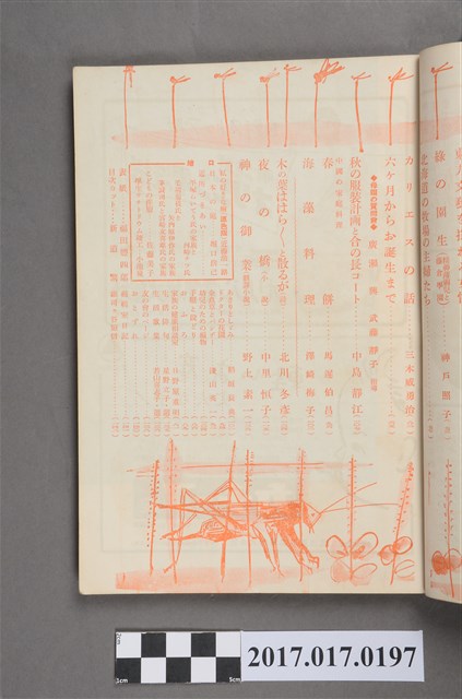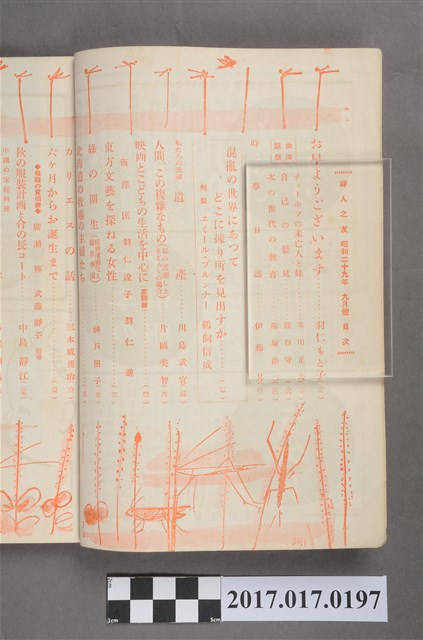 本文件為婦人之友社發行之《婦人之友》第48卷第9號,內容為:おはようございます/羽仁とも子、チェーホフ/米川正夫、自己の發見/熊谷守一、次の世代教育/飯塚浩二、時事日誌/伊藤昇、混亂の世界にあって據り所を見出すか/鵜飼信成、遺産/川島武宜、人間この複雜なもの/片岡美智、映画と子供の生活を中心に、東方文藝を探ねる女性、綠の園生/神戶照子、北海道の牧場の主婦たち、カリエスの話/三木威勇、六ヶ月からお誕生日まで、秋の服裝計畫と合の長コート/中島靜江、海藻料理、中國の家庭料理春餅/馬遲伯昌、木の葉ははらはらと散るが/北川冬彥、夜の橋/中里恒子、神の御業/野上素一、あさりとしみ、主婦の健康相談室/日野原重明、ドクターの花園、金魚草とハンチ/淺山英一、幼兒のための編物、手順と段どり、おふろ、生活歌集/若山喜志子選、生活非句/星野立子選、友の會のページ、おとずれ、編輯室日記、雜司ヶ谷短信、口繪。日本大正末期至昭和初期,由於關東大地震連帶使社會不景氣,出版社開始流行出版円本(類似專題書籍,常見命名為xx全集稱之)與文庫書(以A6為尺寸的書),除了一般書籍的編印外,為了及時反映社會訊息雜誌遂逐漸流行,譬如1932年日本圖謀建立滿州國時,日本國內就出現許多評論當時中國大陸的相關消息,1937年由於蘆溝橋事變,日本為了確保軍事物資,遂進行經濟統制,日本出版界便以情報宣傳機關管理國家力量開始介入,1938年甚至公告兒童雜誌字數限制、附錄廢止等政策,隨著戰事緊張,一些較無戰爭宣傳的雜誌被統合廢止,兒童或婦人雜誌也無法倖免,戰後,雜誌出版才得以逐一恢復。婦人之友社創立於1903年前身為『家庭の友』,創辦人為羽仁もと子與羽仁吉一,創刊目的基於基督教信仰如何向民眾傳達及經營理想家庭,而今(2015)仍持續發行。