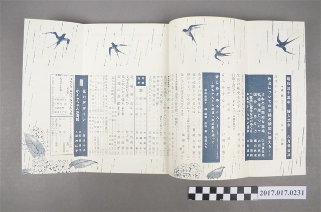 本文件為婦人之友社發行之《婦人之友》第52卷第6號,內容為:真理のかいやき/羽仁もと子、政治についての主婦の疑問に答える、時と人、生活の歴史をたずねて/瀨川清子、自由と創意と、盜みをする子/戶川行男、音にめざめるころ、あぶくまの山脈を背に/中村妙子、夜の授乳をやめるには/緒方安雄、静けさよひろがれ、母と子の記録する大学生々活/藤田真之、888の時間割 食事の後片附一時間、子供と楽しく遊ぶ時間も/渡邊美喜子、齒槽膿漏の話/岡田泰紀、花菖蒲の新種をつく出すよろこび/平尾秀一、フィンランド風の苺ジャム、季節の魚料理?/辰巳浜子、農村食の朝晝夜/石垣康枝、子供と大人のレインコート/武內啟子他、同題隨想、北越暮春/吉野秀雄、文學を読むよろこび/佐古純一郎、風に吹かれる裸木/中川義秀、天使の季節/中里恒子、私のみた映画から、減稅貯蓄案內/關島久雄、全身をのびやかに/牛山喜久子、サラダ、竹細工、テトロン問答、レース編み、園藝問答、婦人之友誕生日、生活歌集/若山喜志子選、生活非句/星野立子選、友の会ニュース、おどずれ、南澤だより、編輯室日記、口繪、色刷、寫真。日本大正末期至昭和初期,由於關東大地震連帶使社會不景氣,出版社開始流行出版円本(類似專題書籍,常見命名為xx全集稱之)與文庫書(以A6為尺寸的書),除了一般書籍的編印外,為了及時反映社會訊息雜誌遂逐漸流行,譬如1932年日本圖謀建立滿州國時,日本國內就出現許多評論當時中國大陸的相關消息,1937年由於蘆溝橋事變,日本為了確保軍事物資,遂進行經濟統制,日本出版界便以情報宣傳機關管理國家力量開始介入,1938年甚至公告兒童雜誌字數限制、附錄廢止等政策,隨著戰事緊張,一些較無戰爭宣傳的雜誌被統合廢止,兒童或婦人