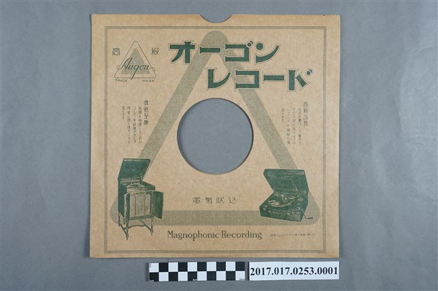 本文件為蟲膠唱片《夜來香》封套,由Augon records印製,印有留聲機之廣告圖案與字樣,用來收納蟲膠唱片,中央圓孔設計方便取納。1907年日美兩方合資成立「日本蓄音器製造株式會社」為日本第一家自製留聲機和唱片的公司。1910年改名為「日本蓄音器商會」,並在同年11月派駐臺機關「日蓄臺北出張所」,開始拓展其在臺業務。然而臺灣黑膠唱片的普及則要到1925年以後,當時為了降低唱片的售價,而採用成本較低的上漆紙板,也一般民眾也負擔得起,此後唱片就逐漸流行起來。隨日蓄在臺灣的「出張所」成立後,日本國內各家唱片公司也紛紛前來臺灣成立「分店」,如鶴標、新高、文聲、羊標、金鳥、東洋、駱駝、飛鷹…等,所發行的唱片以歌仔戲、歌仔曲、山歌、採茶歌為主,展開了臺灣音樂唱片錄製的工作。