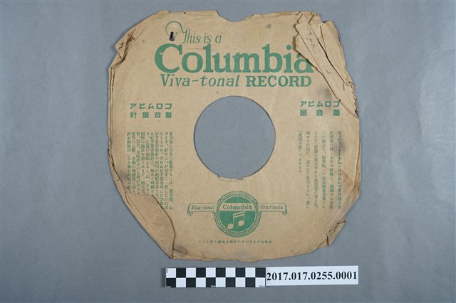 本文件為蟲膠唱片《那無兄》封套,由古倫美亞唱片公司印製,印有留聲機廣告圖案與字樣,用來收納黑膠唱片,中央圓孔設計方便取納,四角有部分折損。1907年日美兩方合資成立「日本蓄音器製造株式會社」為日本第一家自製留聲機和唱片的公司。1910年改名為「日本蓄音器商會」,並在同年11月派駐臺機關「日蓄臺北出張所」,開始拓展其在臺業務。然而臺灣黑膠唱片的普及則要到1925年以後,當時為了降低唱片的售價,而採用成本較低的上漆紙板,也一般民眾也負擔得起,此後唱片就逐漸流行起來。隨日蓄在臺灣的「出張所」成立後,日本國內各家唱片公司也紛紛前來臺灣成立「分店」,如鶴標、新高、文聲、羊標、金鳥、東洋、駱駝、飛鷹…等,所發行的唱片以歌仔戲、歌仔曲、山歌、採茶歌為主,展開了臺灣音樂唱片錄製的工作。