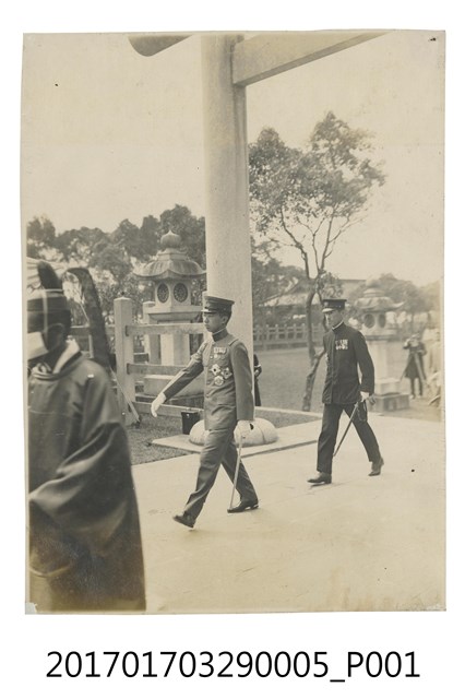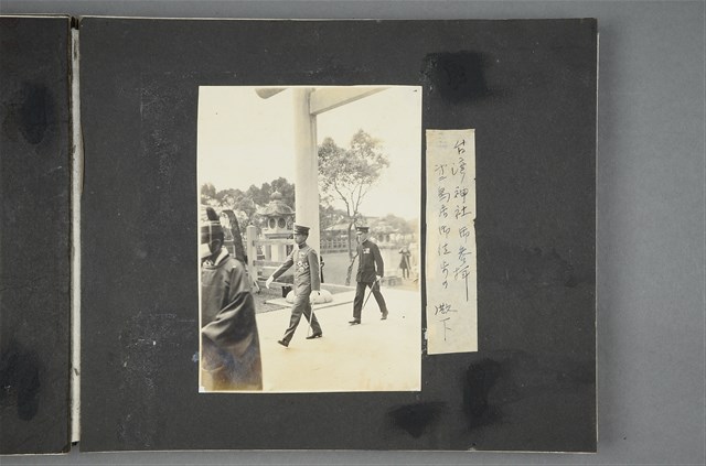 1.本照片為臺灣神社參拜,攝於1923年4月17日9時20分,拍攝地點於官幣大社臺灣神社,照片內容為皇太子裕仁徒步穿越臺灣神社前鳥居之情況,圖中可見大宮司與後方神社石燈籠。
