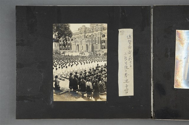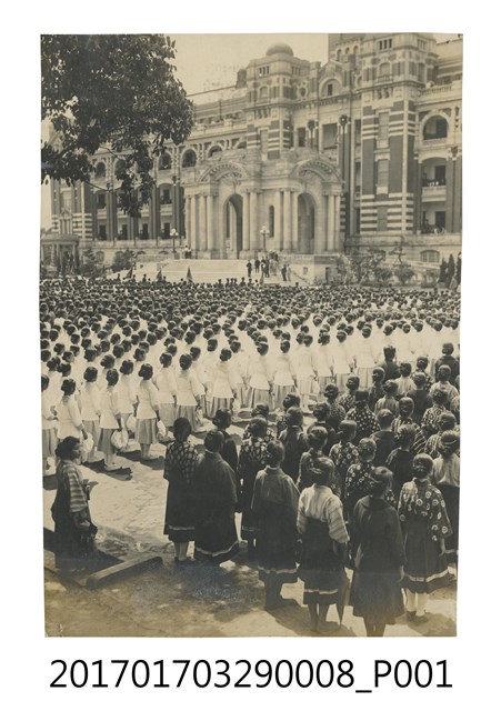 1本照片為總督府前小學生迎奉預演,攝於1923年4月17日,拍攝地點於臺灣總督府,照片內容為全體學生集合總督府前,實施預演為奉迎皇太子裕仁之準備情形,可見全體小學生列隊持太陽旗,教師也列隊在旁,可見總督府建築。