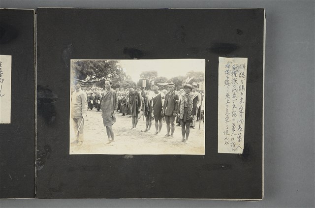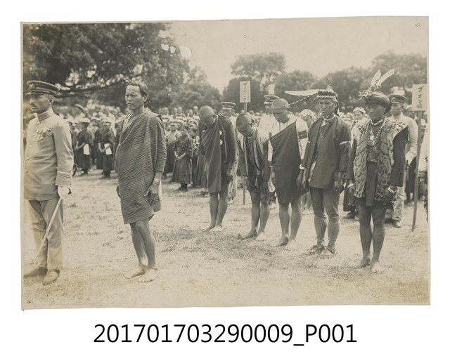 1.本照片為各族蕃人代表致敬,拍攝為1923年4月18日,拍攝地點為臺北御泊所前廣場(總督府官邸),照片內容為總督府安排各族蕃人代表一名向皇太子裕仁致敬,後方可見布農族(ブヌン族)與賽夏族(サイヤツー族)之木牌。