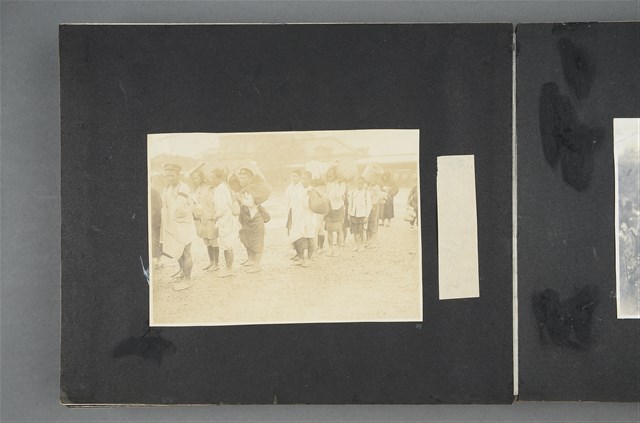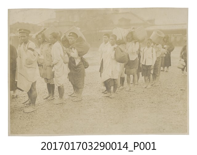 1.本照片為候車男子,拍攝於1923年4月,拍攝地點不明,圖中可見數民男子列隊一側,手語肩上持著行囊與竹簍,等候座車。