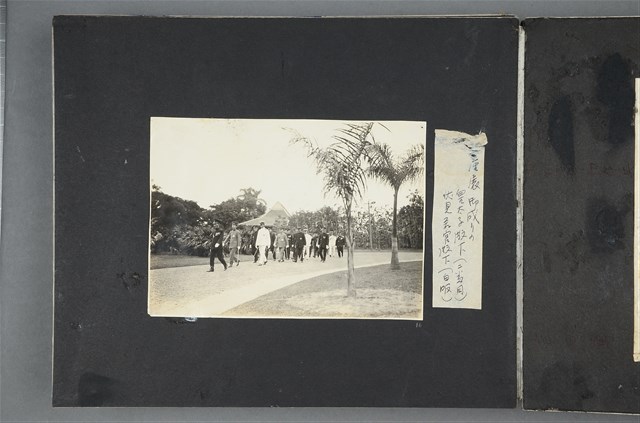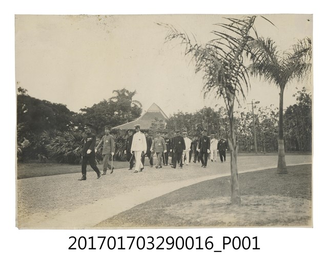 1.本照片為參觀臺灣生產品展覽會,拍攝於1923年4月17日13時左右,拍攝地點為參觀臺灣生產品展覽會館(今臺北植物園),圖中皇太子裕仁與隨行伏見宮博義王共同參觀臺灣生產品展覽會館,展覽園區兩旁可見整齊椰樹。