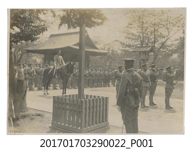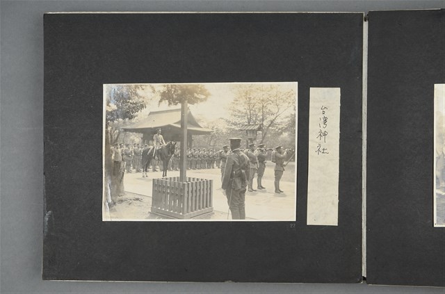 此份文物為日治時期的黑白照片,內容為臺灣神社軍事儀式,神社佈滿了日本士兵,廣場前還有一排士兵正吹著類似嗩吶的樂器,後方有名軍官正騎乘於馬匹上頭,右手拿著武士刀,目光投向前方。