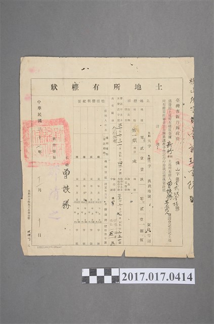 2017.017.0414 民國37年新竹縣曾娘勝等12人共有之土地所有權狀