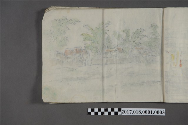 本畫作為一幅手繪的臺灣風景圖,以黑色畫筆勾勒出線條,視角由遠處望向村落,村落樹木林立。村落右側為開放式入口,並畫有兩個人像。文物如屋頂及樹林皆上有顏料,紙張上方處有藍色顏料暈開的痕跡,中央則有對摺痕跡。