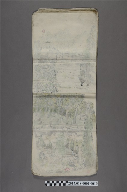 本畫作於日治時期,為一幅手繪的臺灣風景,其中樹葉部分以綠色為點綴,天空則為淡藍色。圖畫近處的樹叢中有一間日式屋舍;中間地帶屋舍較為密集,一旁鋪有石階並往上延伸至鳥居及神社。古城江觀為日治時期畫家,受學於京都藝術家山元春舉,1924年在台灣進行全島創作寫生,其作品曾入選帝國美展,並曾於臺灣總督府舉辦畫展。