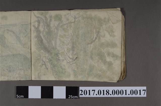 本畫作年代為日治時期,為手繪的臺灣山林圖,以綠色顏料暈染於樹林間。文物保存狀況良好,圖畫取景於樹林間,右側可見明顯的樹幹形狀,左側則為茂密的樹葉。古城江觀為日治時期畫家,受學於京都藝術家山元春舉,1924年在台灣進行全島創作寫生,其作品曾入選帝國美展,並曾於臺灣總督府舉辦畫展。