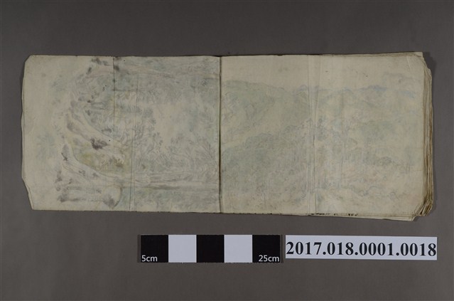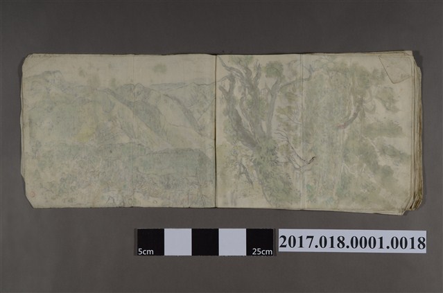 本畫作年代為日治時期,為手繪的臺灣山林圖,以藍色、綠色及橘色作為暈染效果的顏料。風景由遠至近為高聳的山脈、樹林茂密的坡地,其中遠處山脈的溝壑繪製清晰。文物保存良好,紙張右下角蓋有紅色圓圈。古城江觀為日治時期畫家,受學於京都藝術家山元春舉,1924年在台灣進行全島創作寫生,其作品曾入選帝國美展,並曾於臺灣總督府舉辦畫展。