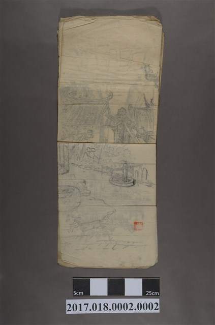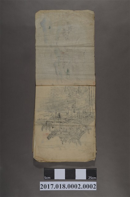 本畫作為日治時期的手繪圖,圖畫上半部為一棟建於高地的中式傳統建物,建物的屋脊裝飾精細,可見有龍及太陽等雕飾。圖畫下半段可見一座汲水幫浦,及一名婦人坐於古井旁洗著衣服。紙張左下角蓋有紅色印章,上方刻有「江觀」的篆體。古城江觀為日治時期畫家,受學於京都藝術家山元春舉,1924年在台灣進行全島創作寫生,其作品曾入選帝國美展,並曾於臺灣總督府舉辦畫展。