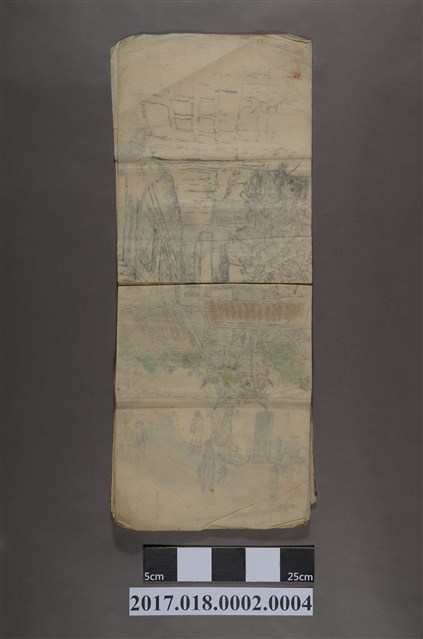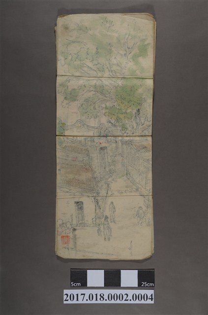 本畫作為日治時期的手繪圖,圖中屋頂及樹木部分以橘色及綠色做暈染效果。街道兩側為傳統磚瓦屋,有的建物為兩層樓式,街道中有五位行人。聚落後方可見一棟特別高出的建物,以及大王椰子樹。紙張右下角蓋有紅色印章,上方刻有「江觀」的篆體。古城江觀為日治時期畫家,受學於京都藝術家山元春舉,1924年在台灣進行全島創作寫生,其作品曾入選帝國美展,並曾於臺灣總督府舉辦畫展。