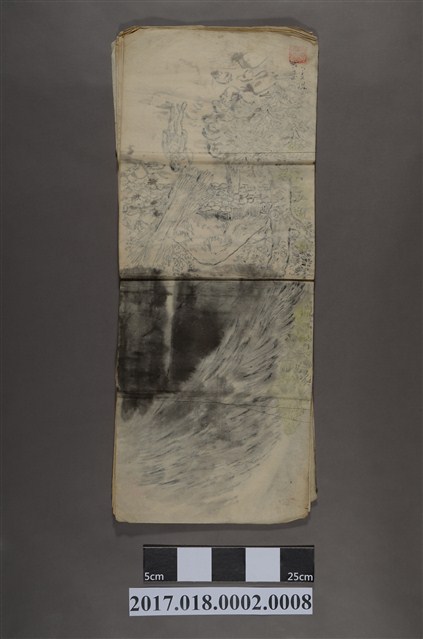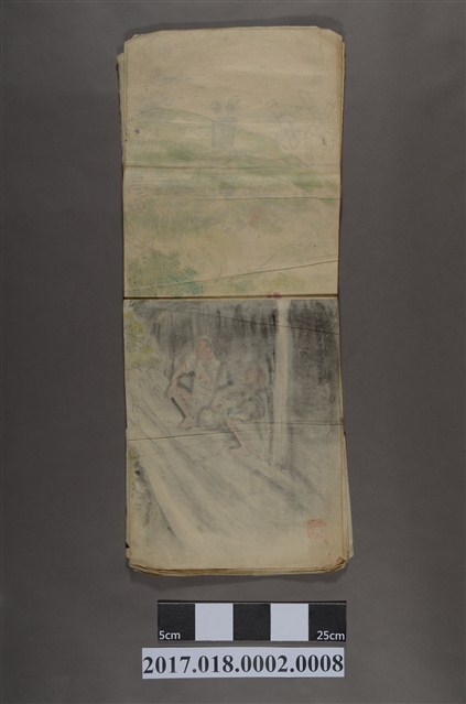 本畫作為日治時期的手繪圖,圖中屋舍部分則以黑色做暈染效果。紙張左下角蓋有紅色印章,上方刻有「江觀」的篆體。圖畫內容為兩名著傳統服飾的原住民,一男一女坐於屋舍前,其中的男性倚靠屋舍的柱子。該屋舍的屋頂由茅草鋪成,屋舍旁的樹木為淡綠色。古城江觀為日治時期畫家,受學於京都藝術家山元春舉,1924年在台灣進行全島創作寫生,其作品曾入選帝國美展,並曾於臺灣總督府舉辦畫展。