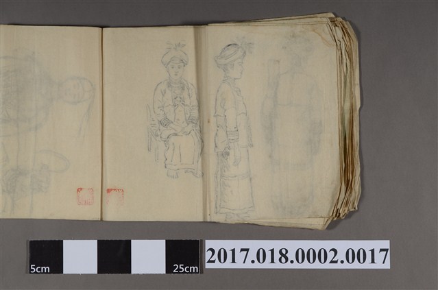 本畫作為日治時期的手繪圖,畫中除了畫筆外,可見鉛筆筆跡。畫中人物為一名身穿傳統服飾的原住民婦女,可分為正面坐姿、側面站姿及背面站姿三種。該婦女的頭巾上插有葉狀物,脖子則掛著數條項鍊,且三張皆為赤腳樣。古城江觀為日治時期畫家,受學於京都藝術家山元春舉,1924年在台灣進行全島創作寫生,其作品曾入選帝國美展,並曾於臺灣總督府舉辦畫展。