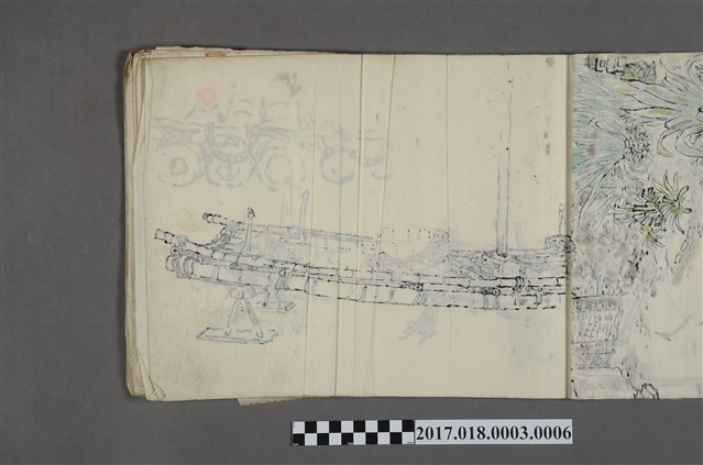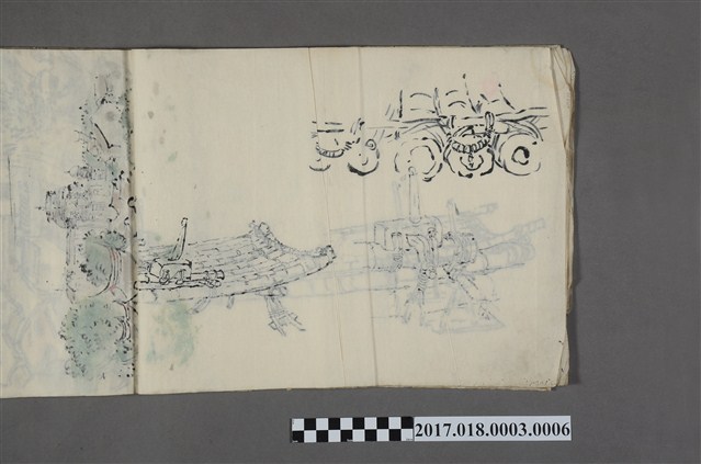 本畫作為日治時期的手繪圖,畫中繪有一艘畫工精細的竹筏架於木造支架上。竹筏左側有左右突出物,中央立有船桅,右側擺有木桶。紙張左側畫有竹筏部分構造的特寫,紙張中央則有淡藍色的顏料痕,右上方有紅色圓圈。古城江觀為日治時期畫家,受學於京都藝術家山元春舉,1924年在台灣進行全島創作寫生,其作品曾入選帝國美展,並曾於臺灣總督府舉辦畫展。