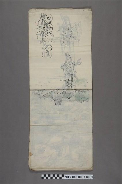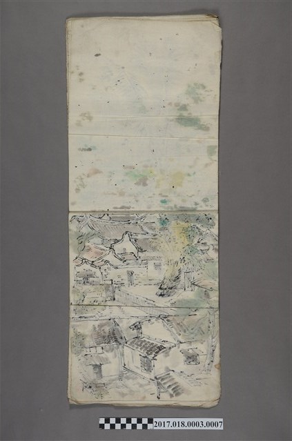 本畫作為日治時期的手繪圖,繪有傳統建築的聚落,聚落中有的屋頂為燕尾脊形式,亦有三合院形式,聚落後方可見一棟西式建物。本畫作以畫筆勾勒線條,在屋頂、天空、樹木等處以暈染的方式塗上顏色。文物保存良好,紙張右下角有兩處紅色圓圈,紙張的四個角落有些為摺痕。古城江觀為日治時期畫家,受學於京都藝術家山元春舉,1924年在台灣進行全島創作寫生,其作品曾入選帝國美展,並曾於臺灣總督府舉辦畫展。