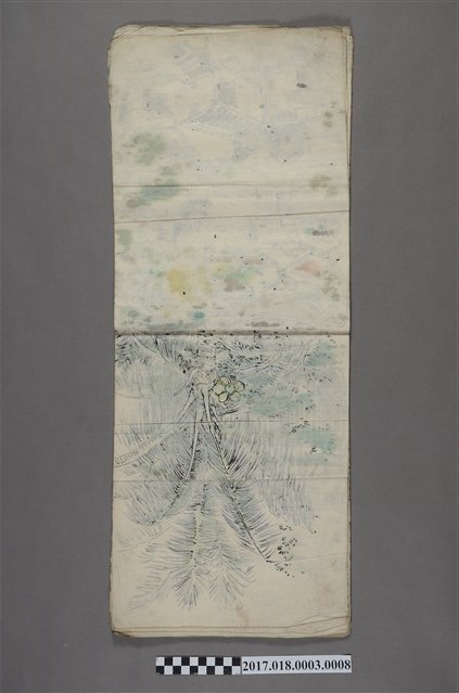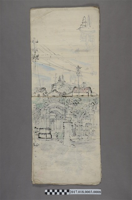 本畫作為日治時期的手繪圖,圖畫繪有一棟西式建物,該建物前方種有大王椰子樹。本畫作的畫工精細,建物表面的雕花及椰子樹的紋理皆清晰可見。文物保存良好,畫紙有對摺痕跡,及右下角有兩處紅色圓圈。古城江觀為日治時期畫家,受學於京都藝術家山元春舉,1924年在台灣進行全島創作寫生,其作品曾入選帝國美展,並曾於臺灣總督府舉辦畫展。