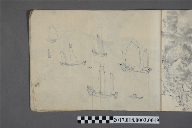 本畫作為日治時期的手繪圖,本畫作的線條較為簡潔,但仍可看出帆船的形狀。畫中有五艘揚起船帆的幅船及三艘小船,其中一艘大船上有一名船伕拿著控制方向的「櫓」。古城江觀為日治時期畫家,受學於京都藝術家山元春舉,1924年在台灣進行全島創作寫生,其作品曾入選帝國美展,並曾於臺灣總督府舉辦畫展。