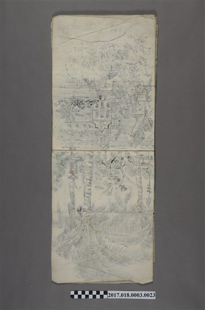 本畫作為日治時期的手繪圖,本畫作左下寫有「屏東製糖会社前」等字,其中「屏東」二字皆附有日文發音。圖中景色有三株明顯的大王椰子,左側花圃內有一座日式石燈,石燈上塗有橘色顏料。圖畫右側遠處立有電線桿。整幅畫作以水墨暈染的方式繪製而成。古城江觀為日治時期畫家,受學於京都藝術家山元春舉,1924年在台灣進行全島創作寫生,其作品曾入選帝國美展,並曾於臺灣總督府舉辦畫展。
