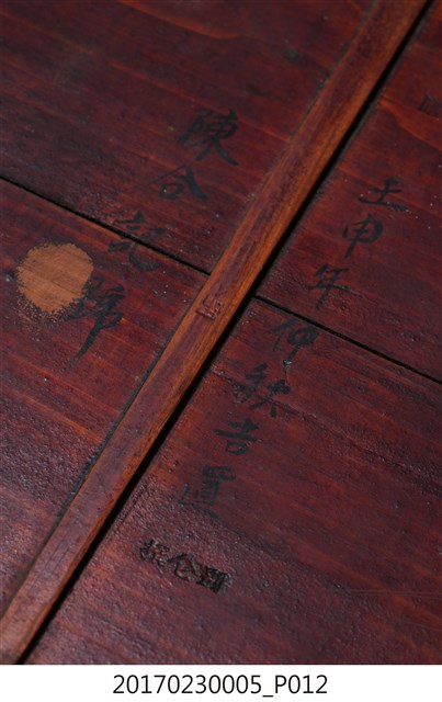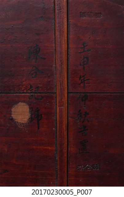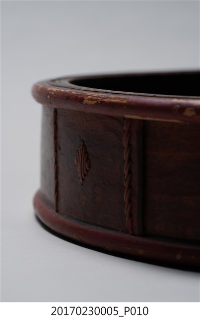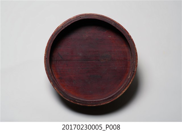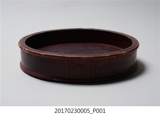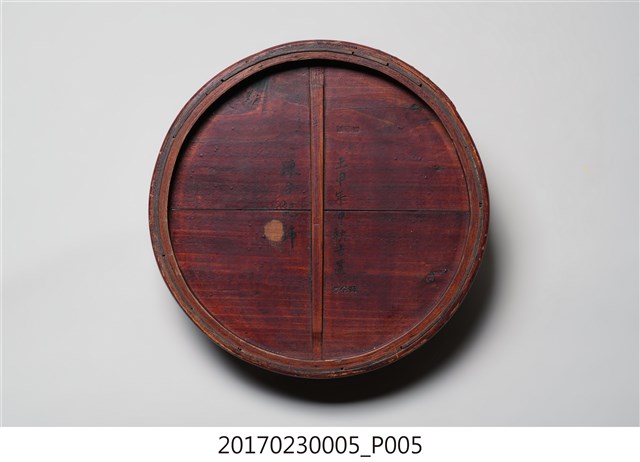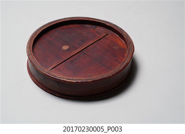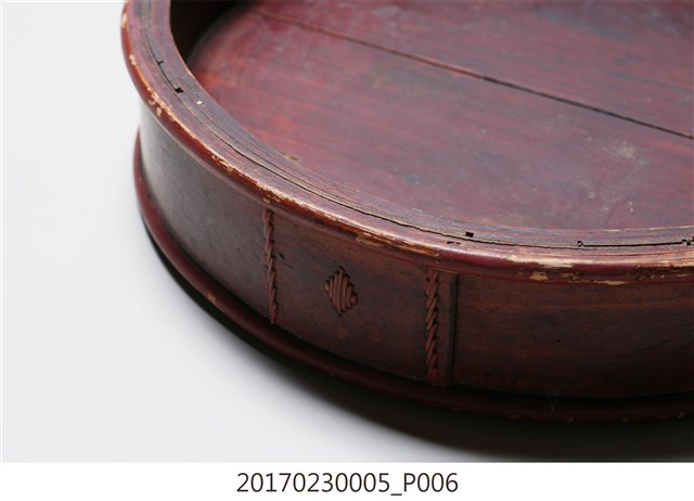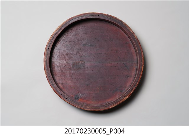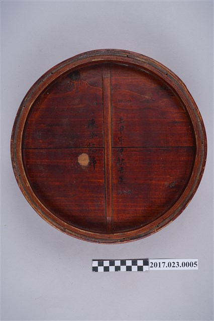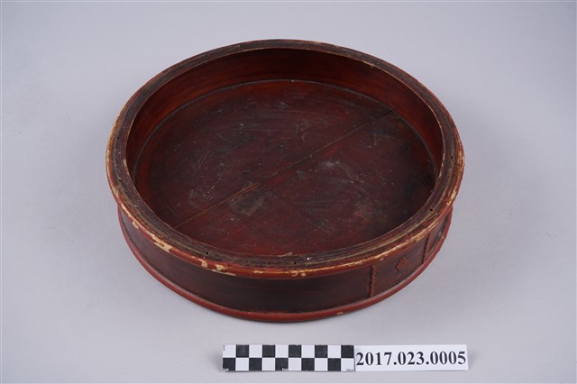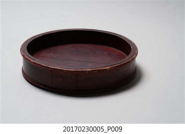 本件為捐贈者夫婿家早期於臺南麻豆開設陳合記號醬油店所用之果盤(民國55年轉賣給成記醬油)。圓果盤以竹木製成,內外通體上朱漆,果盤底部有手書文字「壬申年仲秋吉置 陳合記號」,另有「O倉檢」烙印字。據捐贈者描述,為夫家拜拜放置水果,或奉茶用盤,邊緣有多處使用磨損痕跡。