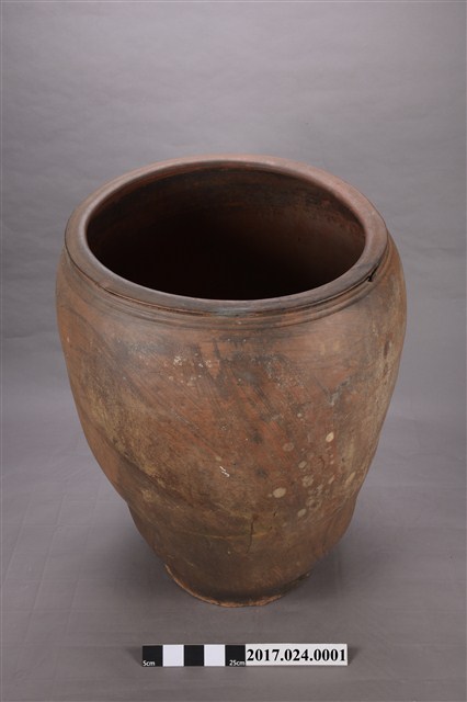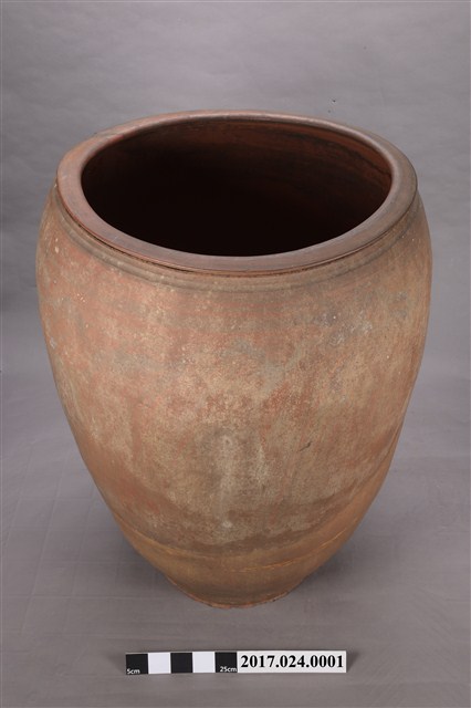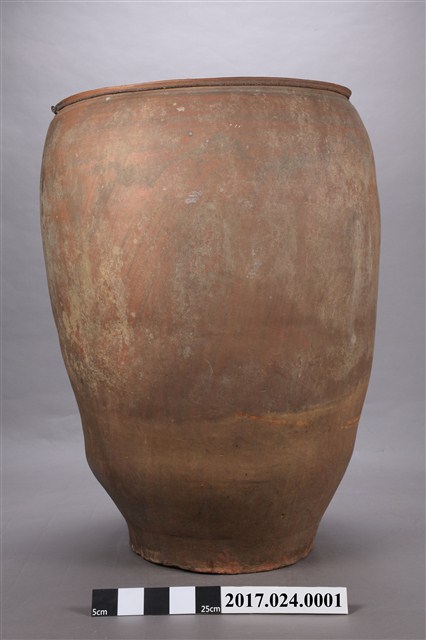 此文物為南投窯防空缸,外觀形狀為上大下小的陶製器具,外觀顏色為咖啡色和土色,有些部分已經有些剝落掉色,缸內顏色也有些剝落且有些微刮痕,另有兩個類似圓形的突出物。(撰稿人:曾國棟)