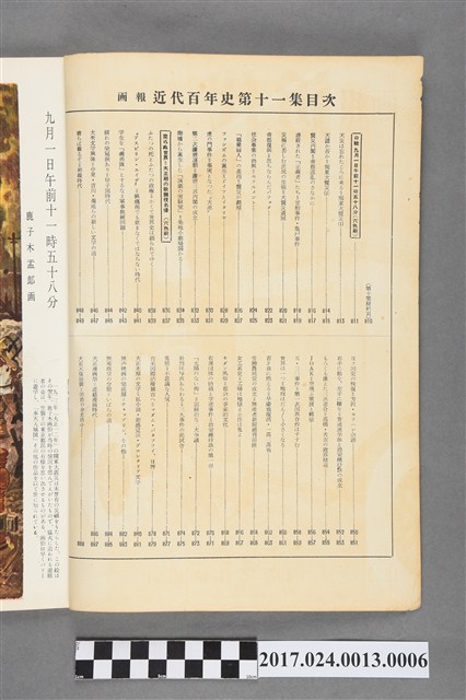 本文物為「畫報近代百年史」第十一集,1923至1926年,內容有關關東大地震、社會事業的勃興、大眾文學興起、勞動人民黨成立、大正天皇駕崩等內容,最後附上年表。「畫報近代百年史」系列雜誌於昭和28 (1953)刊行,其發行目的著重於回顧19世紀後半以來日本歷史的經過,主要以繪畫、照片等視覺資料呈現,共計12集的「畫報近代百年史」。(撰稿人:曾國棟)